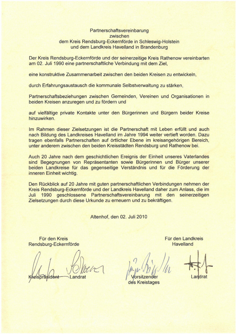 Einen Einblick in die vertrauensvolle, freundschaftlich gepflegte und gelebte Kreispartnerschaft gibt die Broschüre „25 Jahre Partnerschaft“, die anlässlich des 25-jährigen Bestehens der Partnerschaft zwischen dem Kreis Rendsburg-Eckernförde und dem Landkreis Havelland herausgegeben wurde.