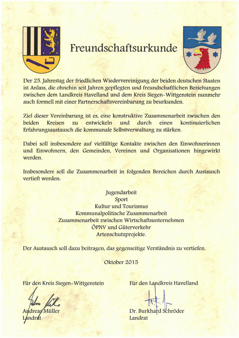 Von Spandau wurde die Frage an den Kreis Siegen-Wittgenstein herangetragen, ob dieser sich vorstellen könnte, Unterstützung für den Aufbau der Verwaltung und den Havelland Kliniken zu geben. Vor diesem Hintergrund sind Mitarbeiter der Kreisverwaltung Siegen-Wittgenstein und des Kreisklinikums Siegen nach Nauen gereist und haben die havelländischen Kollegen unterstützt. In den Folgejahren waren Vertreter des Kreises Nauen - und auch des nach der Kreisreform entstandenen Landkreis Havelland - häufig in den Begegnungen zwischen Siegen-Wittgenstein und Spandau einbezogen. Die so entstandenen partnerschaftlichen Beziehungen fanden ihren Höhepunkt in der Unterzeichnung und den Austausch von Freundschaftsurkunden beider Kreise, die die Landräte Andreas Müller (Kreis Siegen-Wittgenstein) und Dr. Burkhard Schröder (Landkreis Havelland) am 20. Oktober 2015 im Konventsaal des Stiftes Keppel offiziell unterzeichneten.