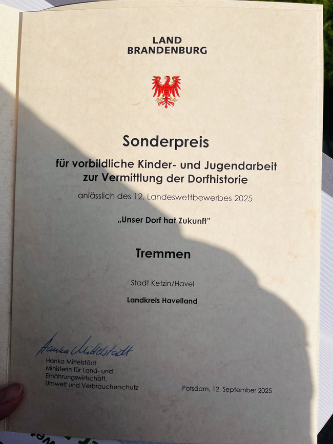 Am 12.09.2025 war es endlich soweit. In Fredersdorf (Landkreis Potsdam-Mittelmark), dem Landessieger aus 2022, fand die Auswertungsveranstaltung zum 12. Landesausscheid "Unser Dorf hat Zukunft" statt. Nach einem tollen Empfang durch die Fredersdorfer Bewohner und bei strahlendem Sonnenschein, wurden die 16 teilgenommenen brandenburger Dörfer vorgestellt und ausgezeichnet. Unser havelländer Kreissieger Tremmen durfte sich über einen "Sonderpreis für vorbildliche Kinder- und Jugendarbeit zur Vermittlung der Dorfhistorie" freuen. Diese Auszeichnung beinhaltete u.a. ein Preisgeld in Höhe von 1.500 EUR.