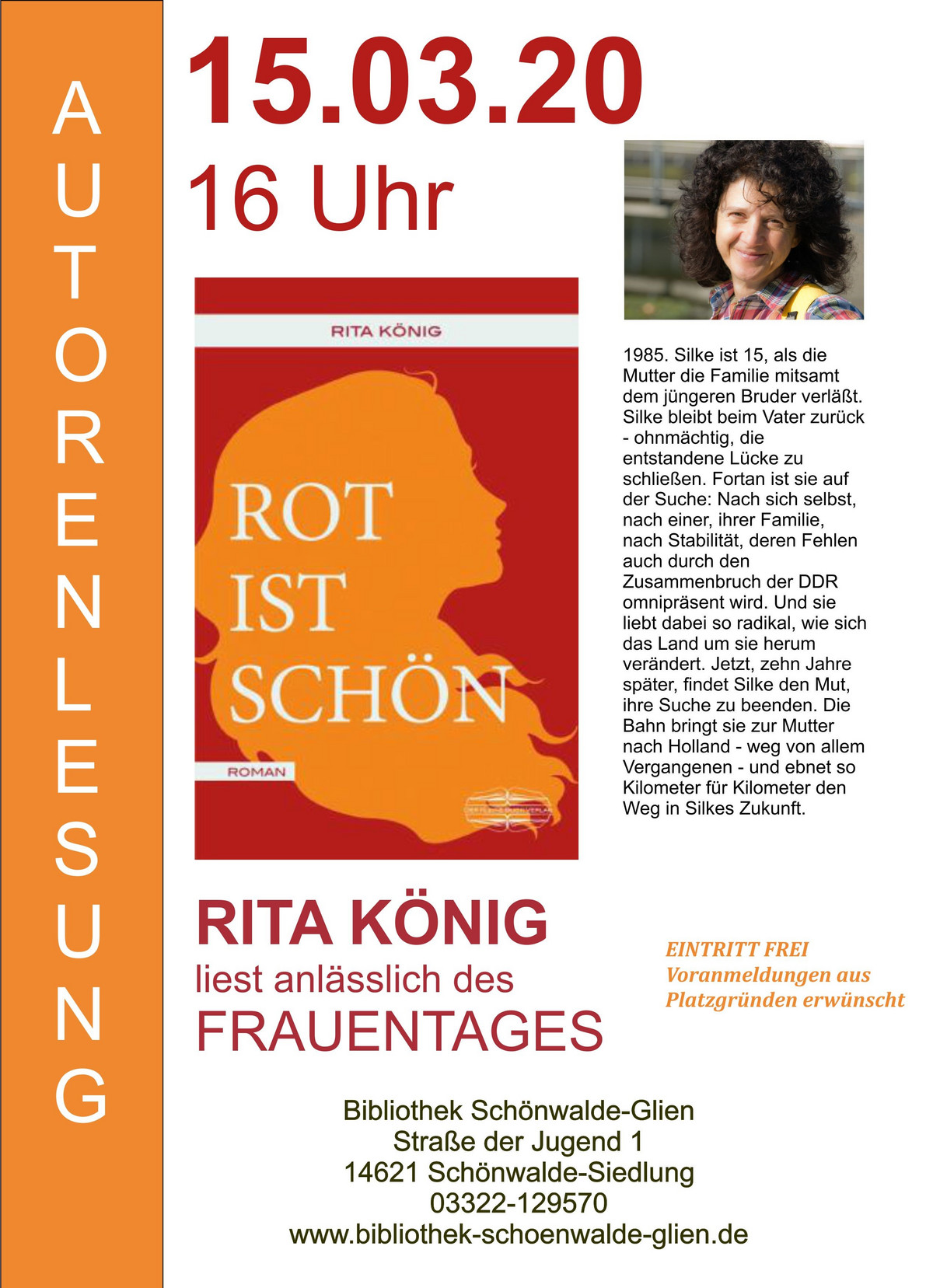 Am 15.03.20 , um 16 Uhr wird die Autorin Rita König ihren Roman "Rot ist schön" in der Bibliothek Schönwalde-Glien vorstellen und möchte mit den Zuhörern über die Träume und Wünsche junger Frauen während der Wendezeit sprechen. Darüber hinaus möchte die Autorin eine Brücke schlagen bezüglich der Erwartungen an die Rolle als Frau 1989 und der Realität im Jahr 2020.