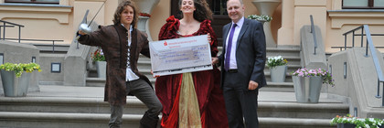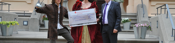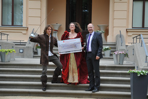 Landrat Roger Lewandowski schaute bei den Proben des Stückes "Die drei Musketiere" vorbei und übergab den Organisatoren der Schlossfestspiele Ribbeck…