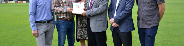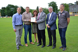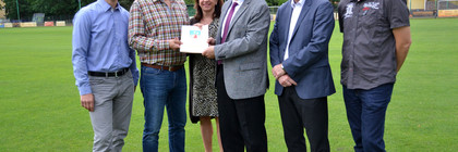 Landrat Roger Lewandowski übergibt Zuwendungsbescheid an den SV Falkensee-Finkenkrug.