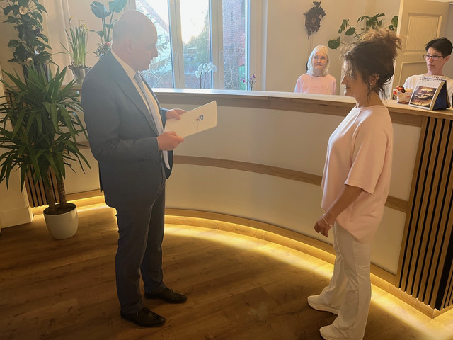 Das Förderprogramm des Landkreises Havelland, mit dem Ärztinnen und Ärzte zur Ansiedelung im Havelland bewogen werden sollen, kommt erneut zur Anwendung. Landrat Roger Lewandowski übergab am 25.02.2026 einen weiteren Zuwendungsbescheid zur Verbesserung der medizinischen Versorgung an eine Ärztin im westlichen Havelland. Raluca Schwuchow, die im vergangenen Jahr ihre Zusatzqualifikation als Fachärztin für Allgemeinmedizin erfolgreich abschloss, hat sich zum Jahresbeginn mit einer Praxis in Rhinow niedergelassen. Sie bietet dort von Montag bis Freitag Sprechzeiten für Patientinnen und Patienten an. Vom neuen Angebot können Patientinnen und Patienten u. a. dahingehend profitieren als Fahrtwege für spezielle Untersuchungen obsolet werden. Das Leistungsspektrum der neuen Praxis ist breitgefächert und umfasst viele verschiedenen Untersuchungen, wie bspw. Ultraschall-, EKG- und Langzeitblutdruckuntersuchungen. Der Landkreis Havelland fördert hierbei die Einrichtung einmalig mit einer Zuwendung in Höhe von 20.000 Euro. Bereits über 1.000 Patientinnen und Patienten wurden seit Januar in der Praxis von Frau Schwuchow aufgenommen und behandelt.
