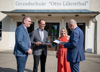 Der Landkreis Havelland fördert weiterhin Bildungseinrichtungen im Havelland mit eigenen Mitteln. Vor diesem Hintergrund überreichte Landrat Roger Lewandowski am Dienstag je einen Bescheid über Fördermittel durch den Landkreis an die „Otto Lilienthal“ Grundschule in Wustermark und an das Schulzentrum Heinz Sielmann in Elstal. Insgesamt stellt der Landkreis den beiden Schulen Mittel in Höhe von 12.951 € zur Verfügung. Nach Auskunft des Schulleiters Herrn Bäker aus Elstal sollen mit den Mitteln u. a. Mikroskope beschafft werden. Schülerinnen und Schüler bedankten sich für die Zuwendung mit einem kurzen Musik- und Sportprogramm. Außerdem überreichten sie den Anwesenden eigene Basteleien und eine kleine kulinarische Kostprobe.
