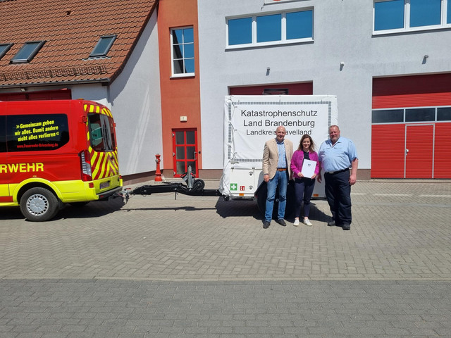 Gemeinsam mit der Bürgermeisterin der Gemeinde Brieselang übergab der Landrat dem Gemeindewehrführer der Freiwilligen Feuerwehr Brieselang, Marco Robitzsch einen Zuwendungsbescheid in Höhe von 38.000€.