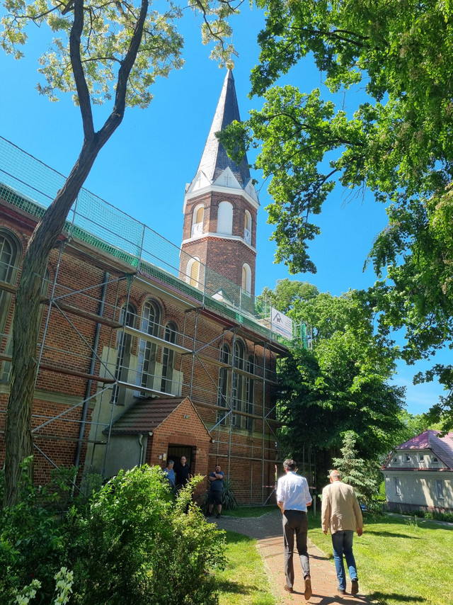 An der Evangelischen Kirche Bredow wurde der Sanierungsfortschritt begutachtet, in der nächsten Baustufe ist das Dach der Kirche vorgesehen.