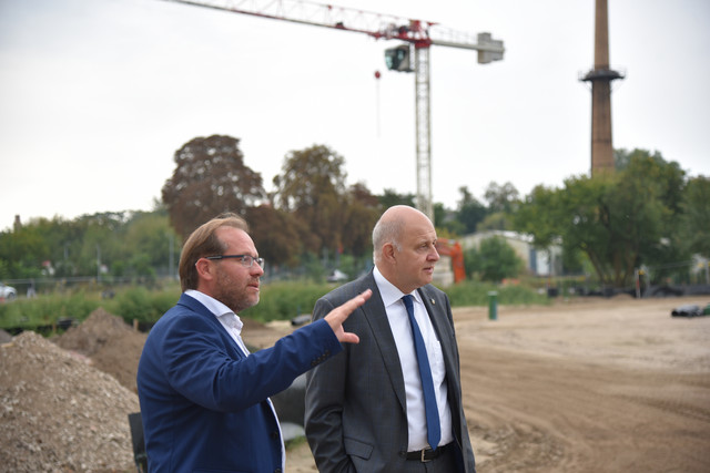Zunächst verschaffte sich der Landrat einen Überblick über den Stand der Sanierungsarbeiten am Sportplatz sowie die Entwicklung beim Bau der Dreifelder-Halle auf dem Bildungs- und Integrationscampus Dr. Georg Graf von Arco. Insgesamt 17,4 Mio. € öffentlicher Mittel werden für die Sanierung des Platzes und die Errichtung der Halle aufgewendet. Nach der Fertigstellung soll die Anlage den Bürgerinnen und Bürgern für den Schul- und Vereinssport sowie für Veranstaltungen zur Verfügung stehen.