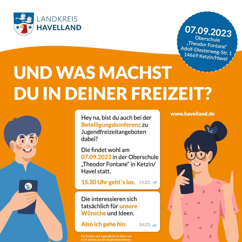 Ihr seid zwischen 6 und 26 Jahren und wohnt im Landkreis Havelland? Prima, dann kommt zur Beteiligungskonferenz in eurer Gemeinde. Erzählt es weiter. Bringt Freundinnen und Freunde mit. Die Beteiligungskonferenzen richten sich auch an Fachkräfte aus der Kinder- und Jugendarbeit sowie Vertreterinnen und Vertreter aus Politik, Verwaltung und Schule.