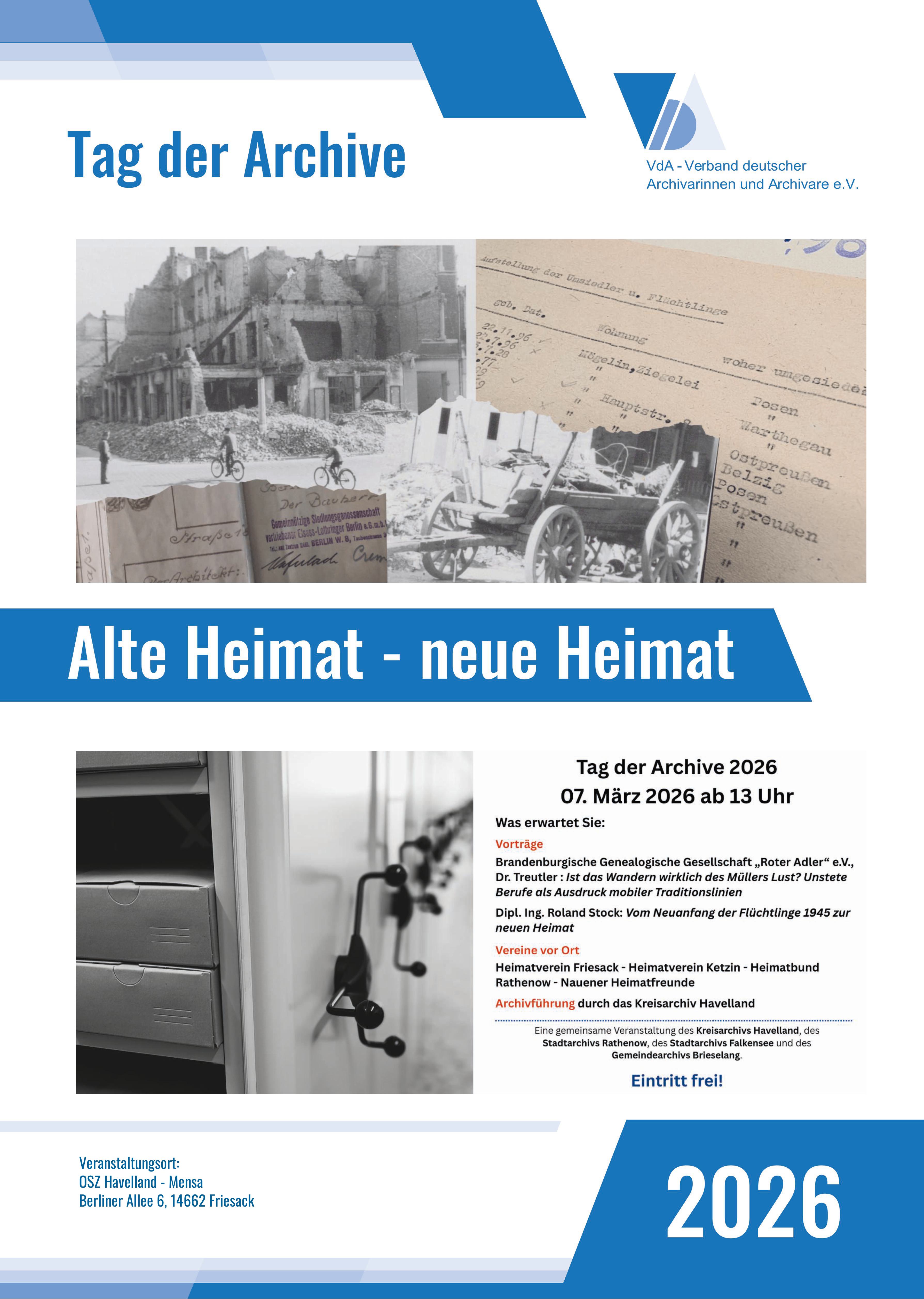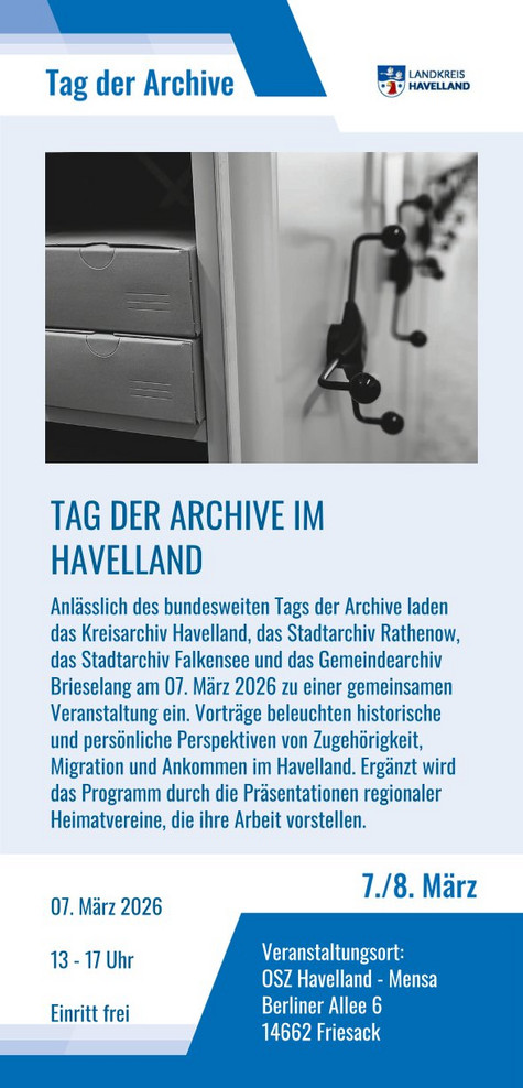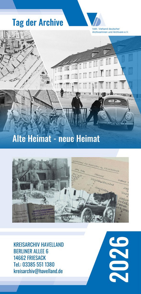 Archive sind wichtige Gedächtnisspeicher einer Gesellschaft. Sie bewahren historische Dokumente, die für jeden Interessierten eine spannende Reise in die Vergangenheit ermöglichen. Das Kreisarchiv Havelland ist zum einen für die Aufbewahrung der Unterlagen der verschiedenen amtlichen Verwaltungsbehörden im Gebiet des heutigen Landkreises zuständig. Gleichzeitig sammelt es auch Schriftstücke aus sogenannten nichtamtlichen Quellen, wie zum Beispiel von Industriebetrieben, Organisationen, Parteien, Vereinen, Verbänden sowie Privatpersonen in Form von Nachlässen oder Schenkungen. Diese Bestände enthalten oft interessante Informationen, die in den offiziellen Überlieferungen nicht zu finden sind, und spiegeln die vielfältige Geschichte unserer Region wieder.