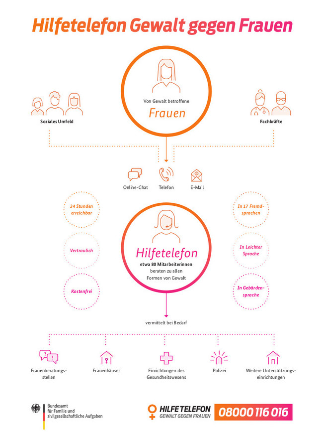 Das im März 2013 eingerichtete, bundesweite Hilfetelefon „Gewalt gegen Frauen“ erleichtert all denen die Kontaktaufnahme, die den Weg zu einer Einrichtung vor Ort zunächst scheuen oder sie aus unterschiedlichen Gründen nicht aufsuchen können.