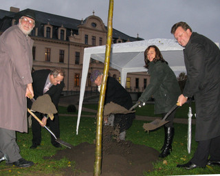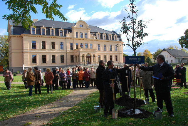 Dr. Gerhard Rudolphi vom Ministerium für Landwirtschaft, Umwelt und Verbraucherschutz Mecklenburg-Vorpommerns setzte am Mittwoch (14. Oktober 2009) gemeinsam mit dem zweiten Beigeordneten des Landkreises Havelland, Dr. Henning Kellner, den Birnbaum für das nördliche Bundesland. Gestiftet wurde ein Baum der Sorte "Wallbirne".