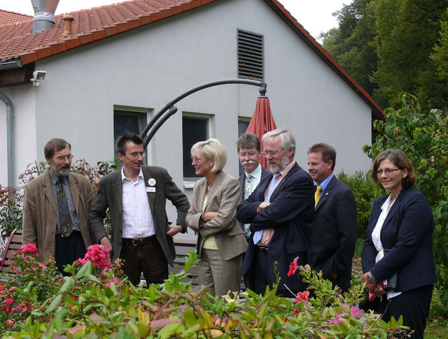 Im Anschluss an die Veranstaltung reiste die Ministerin in Begleitung des Landrates weiter nach Ketzin zum evangelischen Seniorenzentrum "Kurt Bohm". Die Einrichtung ist eine der ersten im Kreis, die sich an der Pflegeinitivative "Später beginnt jetzt" beteiligen, welche das Ministerium im Juni dieses Jahres ins Leben gerufen hat. Peter Molle, engagierter Leiter des Seniorenzentrums, das vom Lafim, Landesausschuss für Innere Mission, getragen wird, informierte die Gäste über die Arbeit mit den Bewohnern. Nach einem Rundgang durch die Einrichtung mit 42 Bewohnern nahm er einen Scheck von Frau Ziegler über 1.500 Euro entgegen. Verwendet wird das Geld für das Projekt "Gesichter im Alter", einer Fotoreihe über das Leben der Hausbewohner. "Wir hoffen damit die Öffentlichkeit zu sensibilisieren, ältere Menschen mehr als Persönlichkeiten wahrzunehmen", begründete Frau Ziegler. Dr. Burkhard Schröder stellte abschließend fest: "Das Ketziner Seniorenzentrum ist ein überdurchschnittliches Beispiel in der Pflegeheimstruktur."
