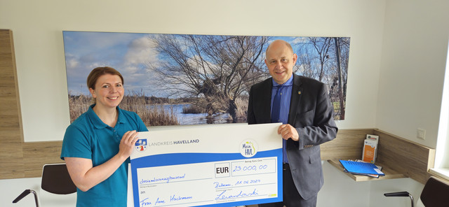 Am 11.06.2024 hat Landrat Roger Lewandowski einen Zuwendungsbescheid zur Verbesserung der medizinischen Versorgung in Höhe von insgesamt 23.000€ an Anne Hackmann überreicht. Der Zuschuss, welcher monatlich ausgezahlt wird und jeweils 1.000€ beträgt, ist ein Stipendium und dient der Unterstützung während ihrer Weiterbildung zur Fachärztin für Allgemeinmedizin. Perspektivisch strebt Frau Hackmann nach ihrer fachärztlichen Weiterbildung an, die Hausarztpraxis für Allgemeinmedizin von Herrn Dr. Czyborra in Rathenow zu übernehmen und damit die medizinische Infrastruktur zu sichern.