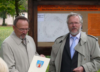 Mit 25.000 Euro unterstützt der Landkreis Havelland die Sanierung des Dorfteiches am Falkenhagener Anger. Am gestrigen Donnerstag, dem 20. September 2007, übergab Landrat Dr. Burkhard Schröder den Zuwendungsbescheid des Landkreises an den Bürgermeister der Stadt Falkensee, Jürgen Bigalke. Treffpunkt war der Uferbereich des Angerteiches. Aus diesem Anlass erschienen waren Anwohner und Beschäftigte der Häuser und Einrichtungen rund um den Angerteich sowie Abgeordnete der Stadt Falkensee.