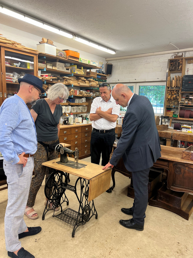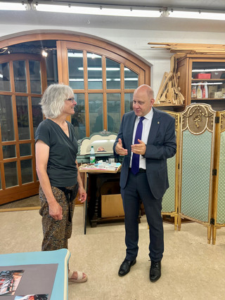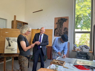 Roger Lewandowski besucht bei seinen Ortsbesuchen in jedem Jahr sämtlich Städte, Ämter und Kommunen im Havelland. Vor dem Atelierbesuch fand ein Verwaltungsgespräch mit dem Bürgermeister statt. Im Nachgang traf sich der Landrat mit den Mitgliedern des Handballvereins Falkensee 04.