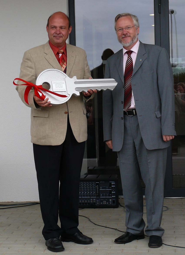Zünftig eingeweiht wurde am Montag, 27. August, die neue Sporthalle am Nauener Schulteil des des Oberstufenzentrums Havelland. Landrat Dr. Burkhard Schröder übergab Schulleiter Eckhard Vierjahn den symbolischen Schlüssel, und danach ging es sportlich zur Sache: In einem Volleyballspiel Verwaltung gegen Schule hat das neue Haus zum ersten Mal seine Funktionalität unter Beweis gestellt.