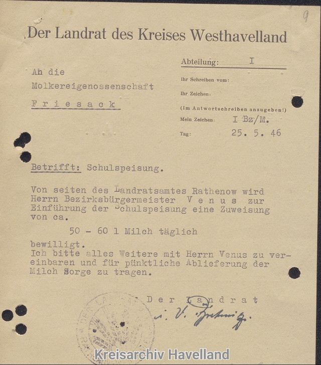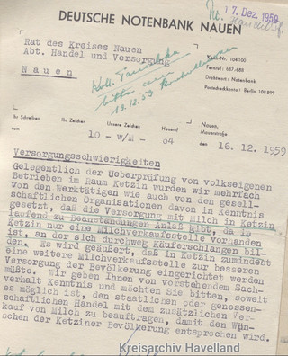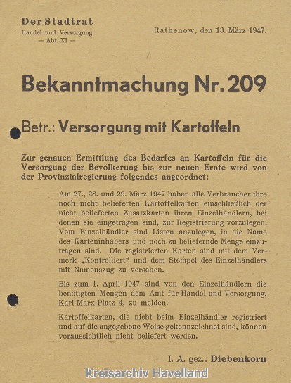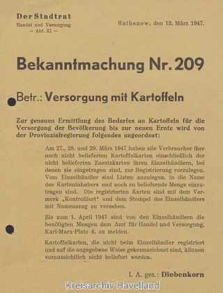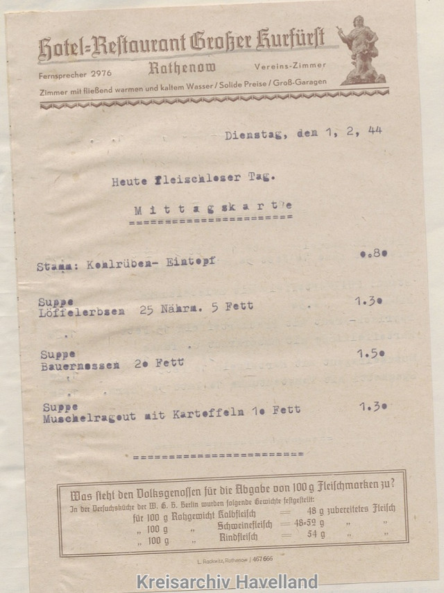 Zu diesem Thema schlummern ebenfalls einige kulinarische Besonderheiten im Kreis- und Verwaltungsarchiv des Landkreises. Sie sind festgehalten in Dokumenten und Fotos. Die Speisekarte aus dem Jahr 1944 vom Hotel und Restaurant Großer Kurfürst, Fotos vom Fürstenhof, Lebensmittelkarten, Informationen zu Versorgungsschwierigkeiten, Schulspeisung und Bekanntmachungen der Abteilung Handel und Versorgung lassen sich im Kreisarchiv finden.