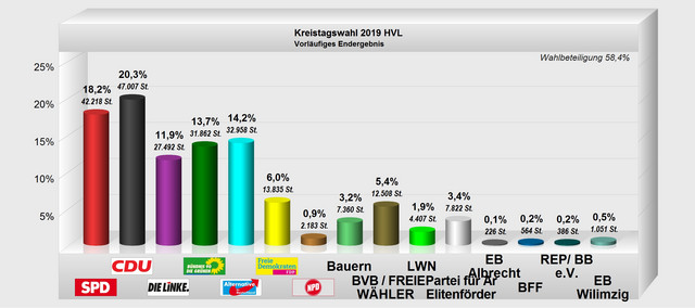 Zur Kreistagswahl waren am Sonntag 80.145 von 137.138 wahlberechtigten Havelländerinnen und Havelländern in 222 Stimmbezirken an die Wahlurne getreten. Das entspricht einer Wahlbeteiligung von 58,4 Prozent. Bei der vergangenen Kreistagswahl im Mai 2014 lag die Wahlbeteiligung noch bei 45,9 Prozent.
