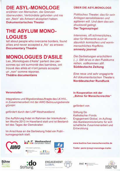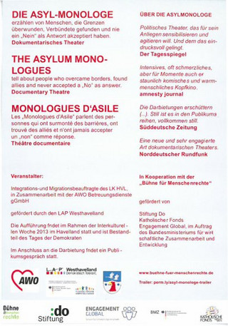 Die Bühne für Menschenrechte zeigt in Rathenow das dokumentarische Theaterstück "DIE ASYL-MONOLOGE" von Michael Ruf. Es wird aufgeführt am