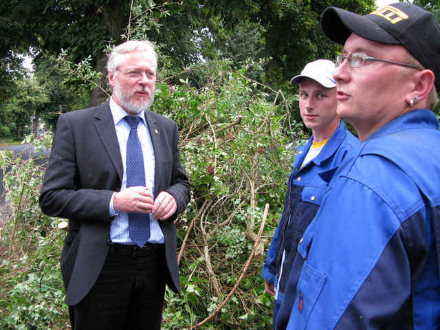 Landrat Dr. Burkhard Schröder besuchte jüngst den Wasser- und Bodenverband "Großer Havelländischer Hauptkanal, Havelkanal, Havelseen", um sich vor Ort über die praktische Umsetzung des 100-Stellen-Programms zu erkundigen. Beim Geschäftsführer des Verbandes, Horst Jorgas, und dem Verbandsvorsteher, Sven Ballmer, erkundigte sich der Verwaltungschef nach dem Erfolg der Maßnahme. Anschließend fuhr er zur Gemeinde Brieselang um die 100-Stellen-Mitarbeiter bei der Arbeit aufzusuchen.