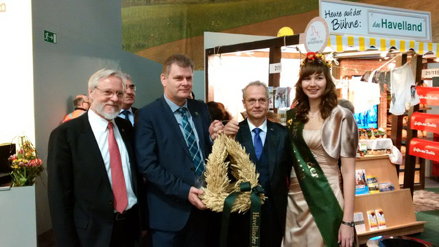Nachdem im vergangenen Jahr die traditionelle Staffelstabübergabe für das Kreiserntefest im Havelland durch die Ausrichtung des Landeserntefestes in Schönwalde-Glien ausfiel, konnte am Dienstag der diesjährige Ausrichter des Kreiserntefestes den Staffelstab übernehmen. Auf der Bühne der Brandenburghalle überreichte Nauens Bürgermeister Detlef Fleischmann die Erntekrone an Wustermarks Bürgermeister Holger Schreiber. Das 8. Kreiserntefest wird am 4. September 2016 in Wustermark stattfinden.