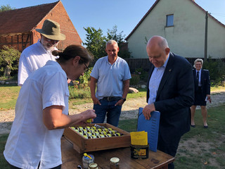 Auch besuchte der Landrat das Wolsierer Unternehmen „SenfSalon“ sowie die Feuerwehr Wolsier, welche diesen Juli unter Ortswehrführer Ivo Repp ihr 90-jähriges Bestehen feierte sowie das nun bald Einjährige der im Herbst 2023 gegründeten Kinderfeuerwehr. Ersteres ist dabei unter Geschäftsführerin Merit Schambach seit 2021 im Ländchen Rhinow ansässig und vertreibt seine ca. 30 ausgefallenen Senfsorten selbst an internationale Kunden - darunter auch fruchtig-süßen Birnensenf passend zur havelländischen Region.