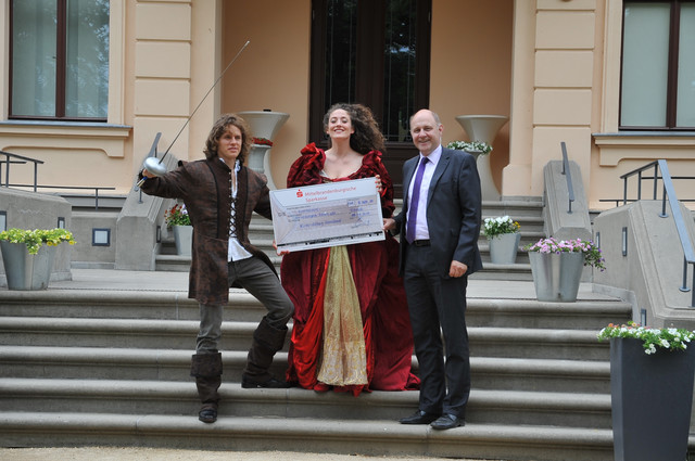 Unterstützt werden die Schlossfestspiele unter anderem vom Landkreis. Landrat Roger Lewandowski schaute bei den Proben vorbei und übergab den Organisatoren der Schlossfestspiele Ribbeck und dem Regisseur Claus Stahnke den symbolischen Förderscheck der Kulturstiftung Havelland in Höhe von 8000 Euro.