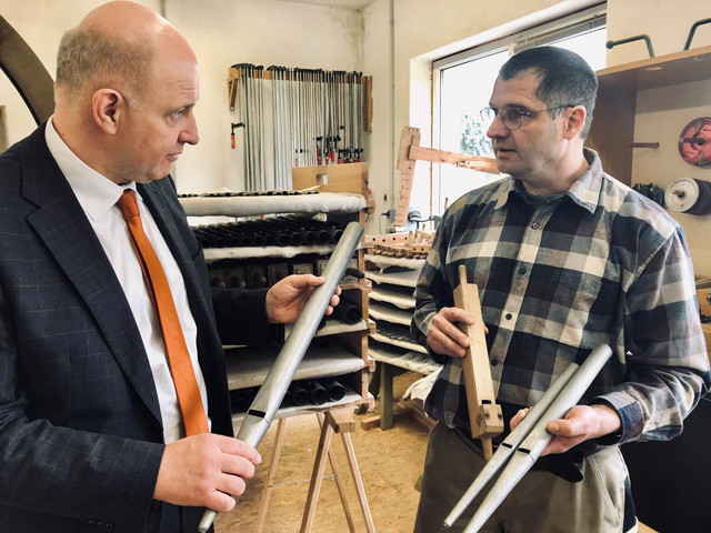 Matthias Beckmann kennt viele der brandenburgischen Kirchen in- und auswendig. Allein in der Hohennauener Kirche im Landkreis Havelland hat er wohl alles in seinen Händen gehabt und erneuert, was dort aus Holz verbaut ist: das gesamte Gestühl, den Fußboden, die Patronatslogen, die Treppen zur Orgel und zur Kanzel. Denn Matthias Beckmann ist nicht nur Orgelbaumeister, sondern auch Tischler und geprüfter Restaurator. Von seiner vielseitigen Handwerkskunst konnte sich auch Landrat Roger Lewandowski überzeugen, der ihn in dieser Woche zum Auftakt seiner Ortsbesuche durch das Havelland in seiner Werkstatt im Friesacker Ortsteil Zootzen-Damm besucht hat.