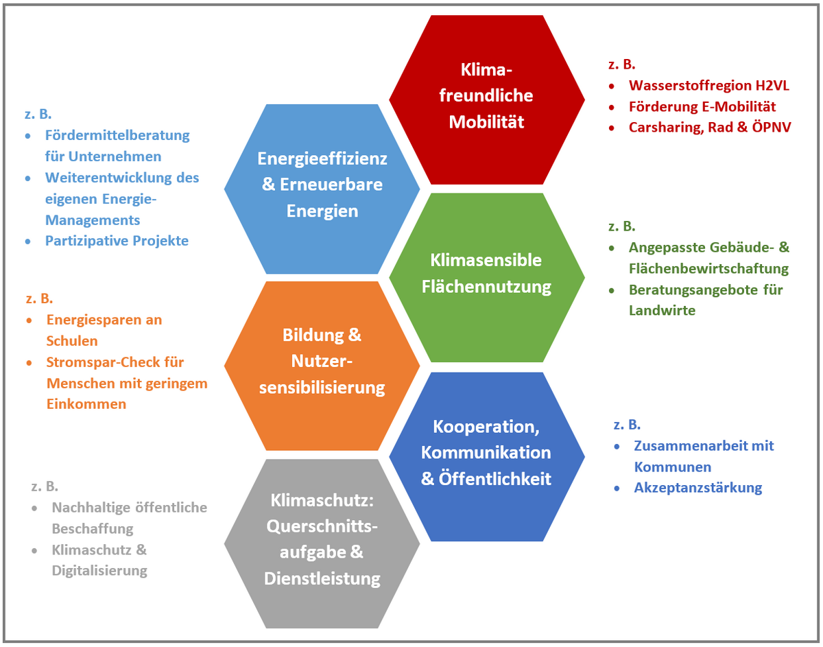 Im Rahmen der Fortschreibung des Klimaschutzkonzepts wurden sechs Handlungsfelder definiert, in deren Rahmen Maßnahmen umgesetzt werden sollen. Zentral bei der Umsetzung des Klimaschutzkonzepts ist der Maßnahmenkatalog im Klimaschutzkonzept (siehe Anhang 2 ab S. 86). Dieser umfasst 37 Maßnahmen in den sechs Handlungsfeldern, die sukzessive umgesetzt werden sollen. Langfristig sollen so die Klimaschutzziele 2030 des Landkreises erreicht werden.