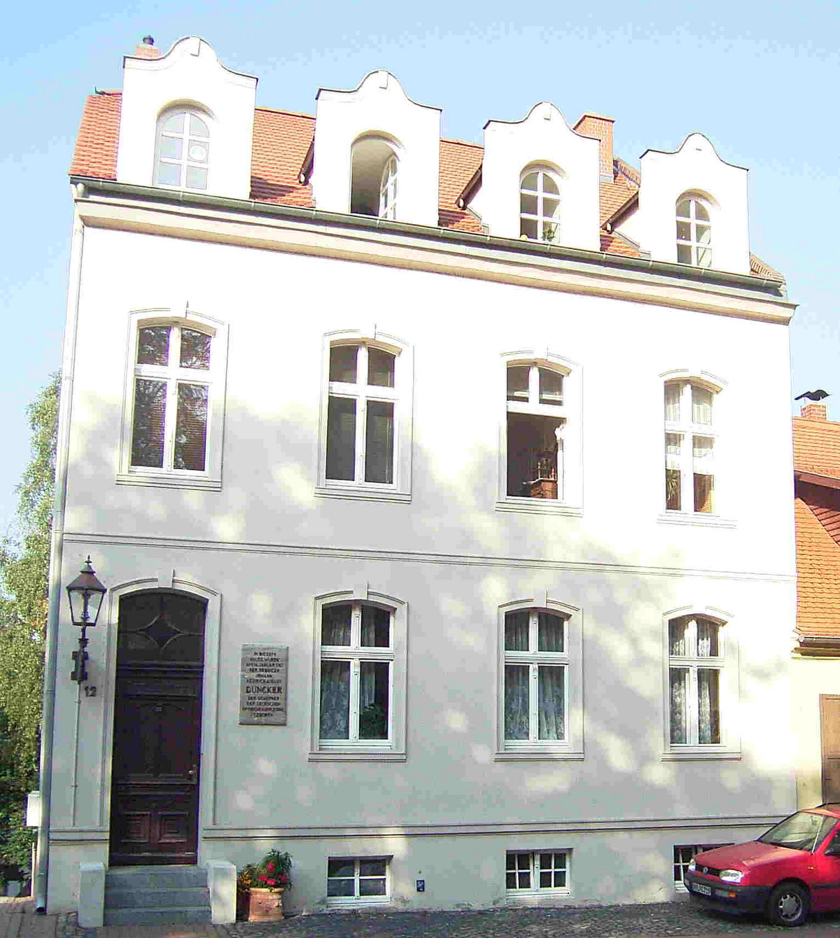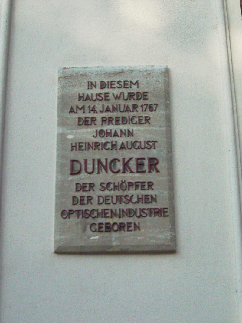 An diesem Haus auf der Westseite des Kirchplatzes erinnert eine Tafel an den Begründer der optischen Indurtrie in Rathenow, Johann Heinrich August Duncker. Hier wurde er geboren und richtete im Jahre 1800 seine erste Werkstatt ein.