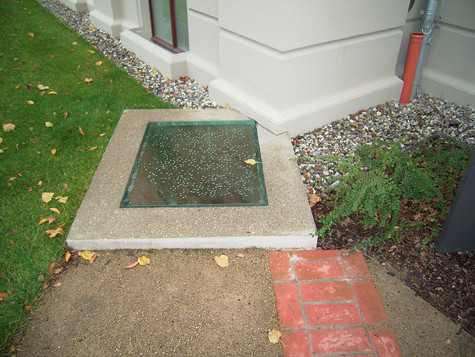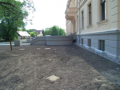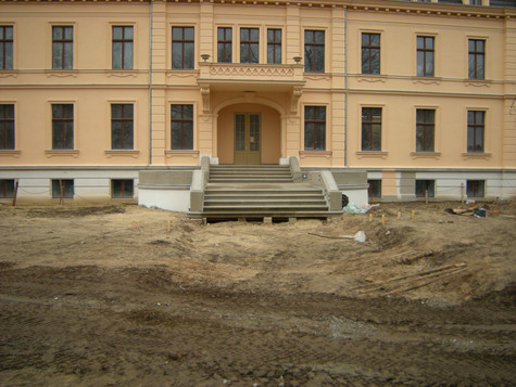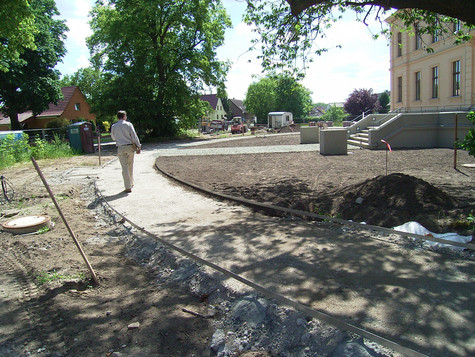Ostseite: Arbeit an den Außenanlagen und Ansicht (rechts) nach Fertigstellung mit verhülltem zweiteiligen Kunstwerk vor der feierlichen Einweihung