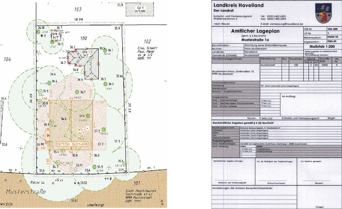 Der Amtliche Lageplan zum Bauantrag hat eine Funktion im Bauordnungsrecht. Er stellt die Situation auf dem Grundstück vor Baubeginn fest, enthält Tatbestände an Grund und Boden, die durch vermessungstechnische Ermittlungen festgestellt worden sind oder auf solche Ermittlungen zurückgehen, die mit öffentlichem Glauben beurkundet sind und ermöglicht erst durch die Einzeichnung der geplanten Gebäude die Entscheidung der Bauaufsichtsbehörde über die Zulässigkeit der Errichtung derselben und eventuell zu beachtende Bedingungen.