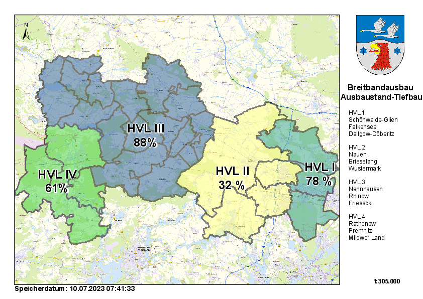Durch die beauftragten Konzessionsnehmer ´Deutsche Telekom GmbH´ und ´e.discom Telekommunikation GmbH´ werden in den 4 Projektgebieten, nach jetzigem Kenntnisstand, gut 300 km Tiefbau durchgeführt und knapp 2.100 km Glasfaserkabel eingebracht. Laut dem jetzigen Stand der Planung werden somit gut 13.000 unterversorgte Adresspunkte zukünftig mit Glasfaser (FTTH / B) versorgt. Darunter befinden sich 59 Schulen, 294 Gewerbetreibende und 2 Krankenhäuser im Landkreis Havelland. Als unterversorgt gelten Anschlüsse mit einer Downloadrate kleiner gleich 30 Mbit/s.